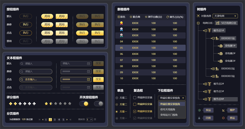 HT 组件库常用组件包括按钮、下拉框、输入框、文本框、进度条等常用功能组件。组件功能完善可提高项目效率,提高设计效果。