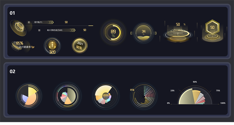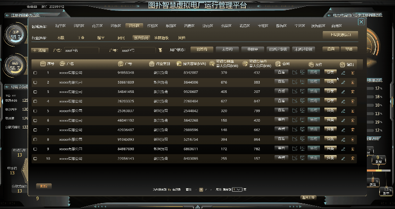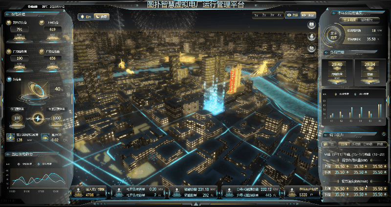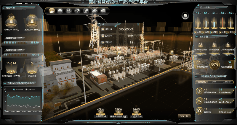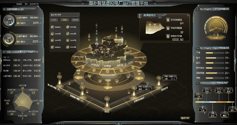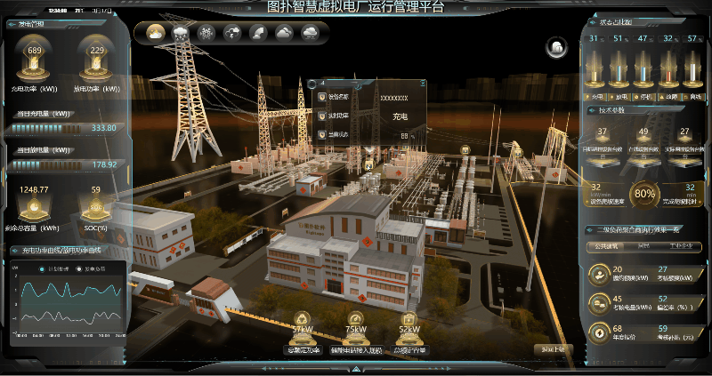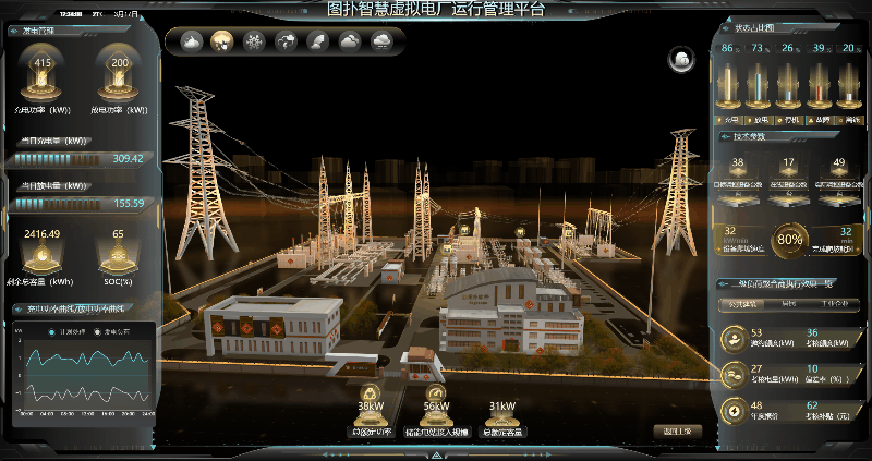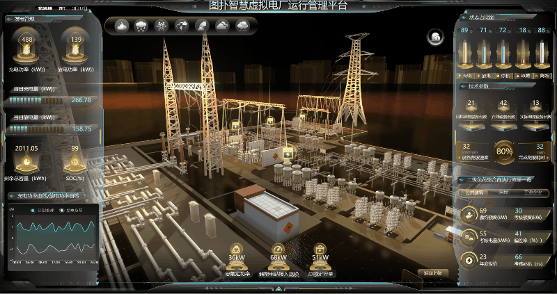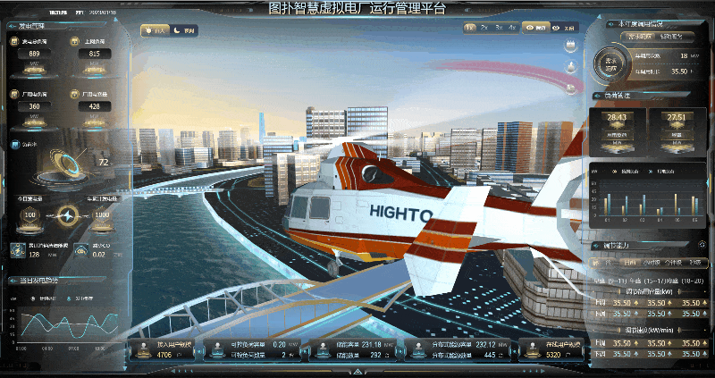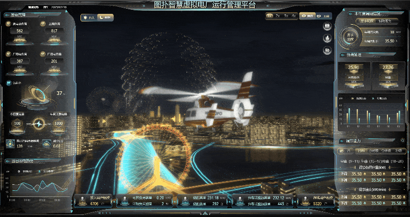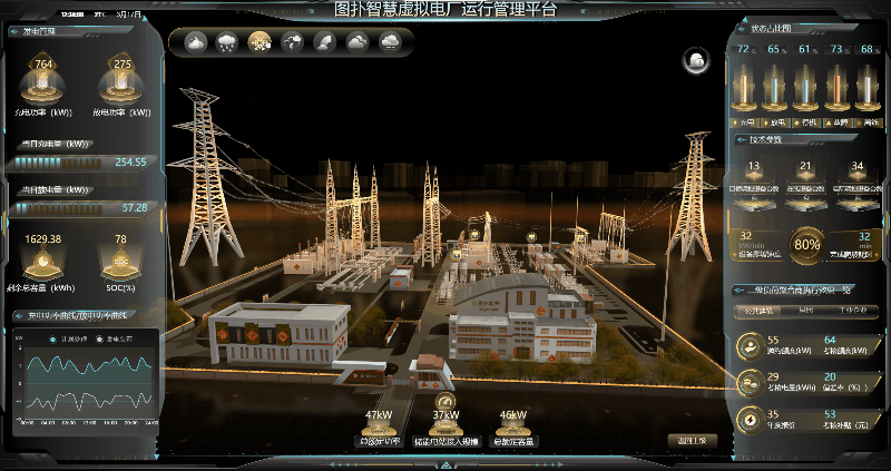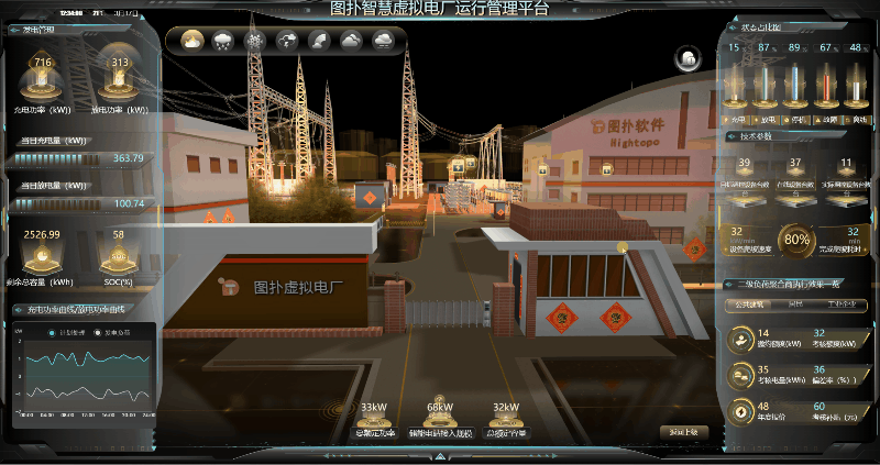 全景化运行效果辅助决策功能核心目的是:运用 HT 自研图形引擎强大的渲染功能、高性能的 WebGL 技术,多维度、实时的、动态呈现虚拟电厂接入的各类负荷资源(如小水电、太阳能发电机组、路灯照明系统、商业楼宇空调、工业企业用能设备、5G 基站、岸电资源等)运行实时状态与技术参数变化趋势;展示虚拟电厂运营调度过程以及评估指标信息展示虚拟电厂各类负荷资源技术参数变化趋势,以可视化技术全面支撑虚拟电厂经营决策。
