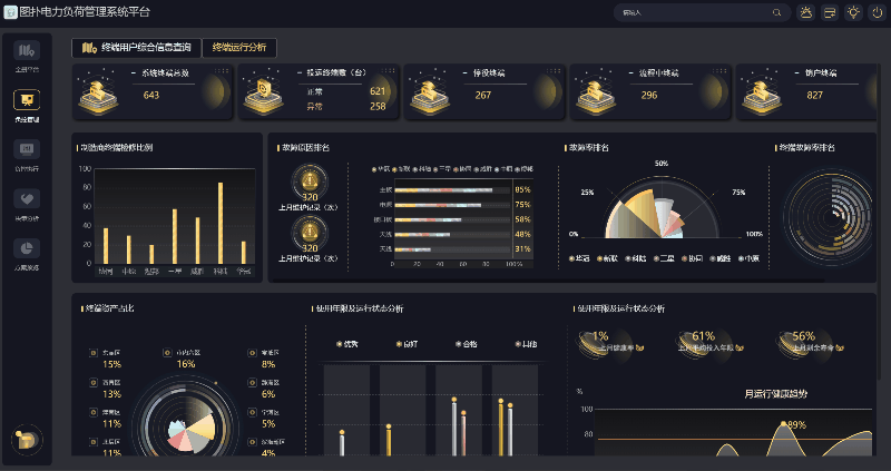 各用户终端运行数据分析,其中重点可查看各用户终端数量,终端故障分析,终端检修等。电网通过新型电力负荷控制系统建设实现对电力用户用电负荷的信息采集、实时监测和精准有序控制。