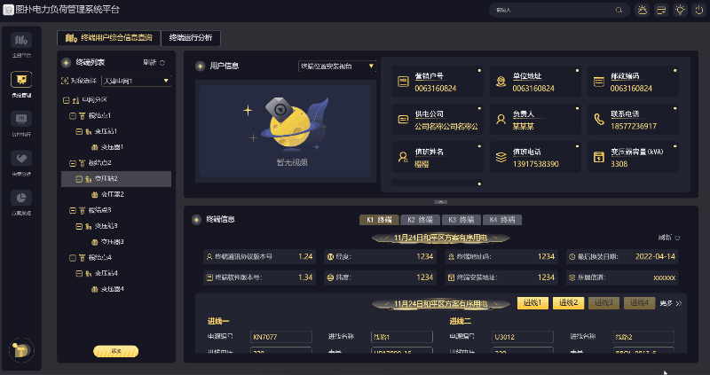 可通过查询列表,搜索各个终端对应的用户信息,主要是电厂客户信息,例如某企业用户下的终端信息,电能表信息等。