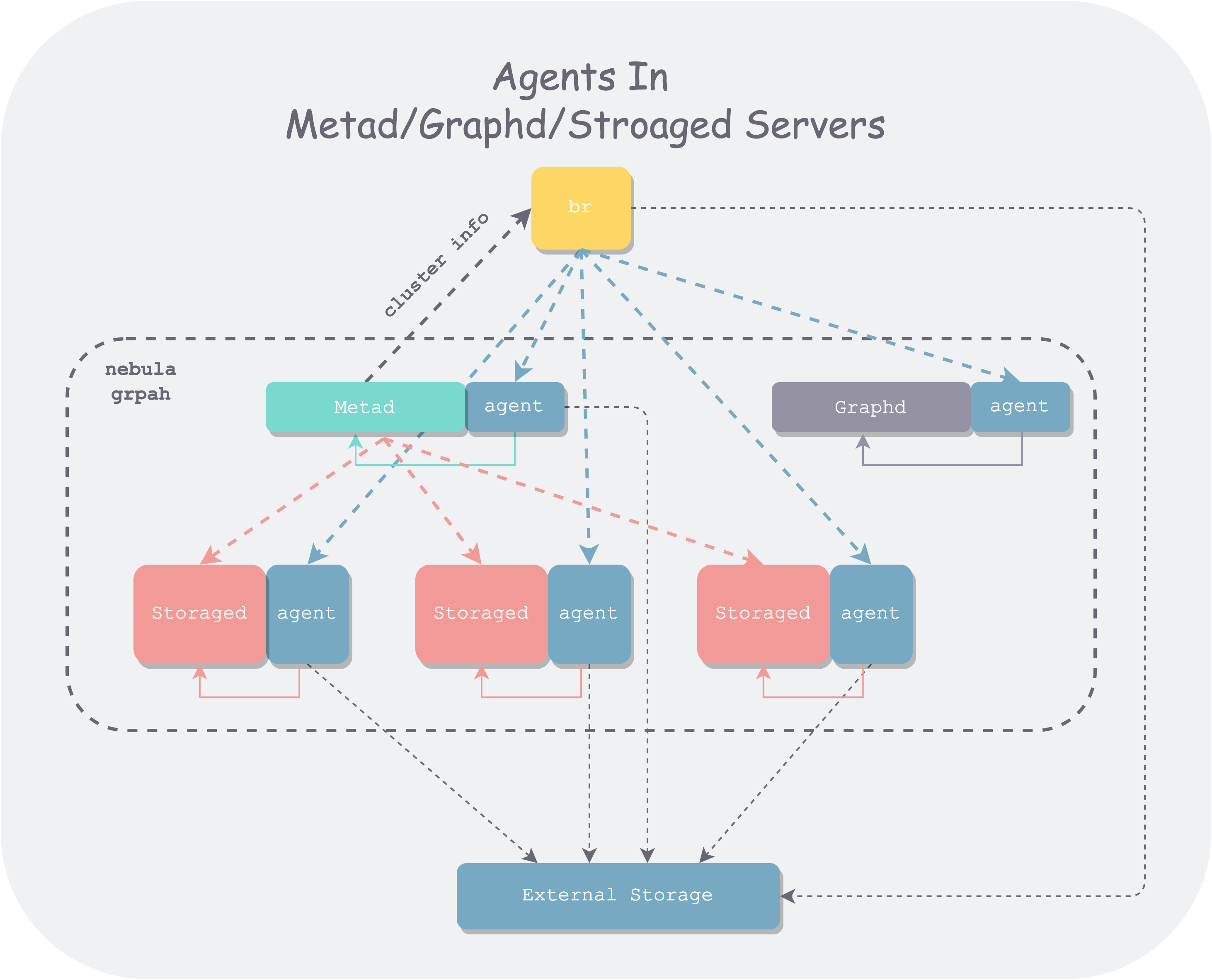NebulaGraph Agent 是一个只关心本机的无状态的 RPC 服务,与 metad 通信,提供备份文件上传和下载、服务起停等接口供 BR 调用。在开始备份恢复前,需要确保集群的每个节点上部署了一个 agent,可以通过 SHOW HOSTS AGENT 查看 agent 的状态。仓库地址在此:https://github.com/vesoft-inc/nebula-agent。