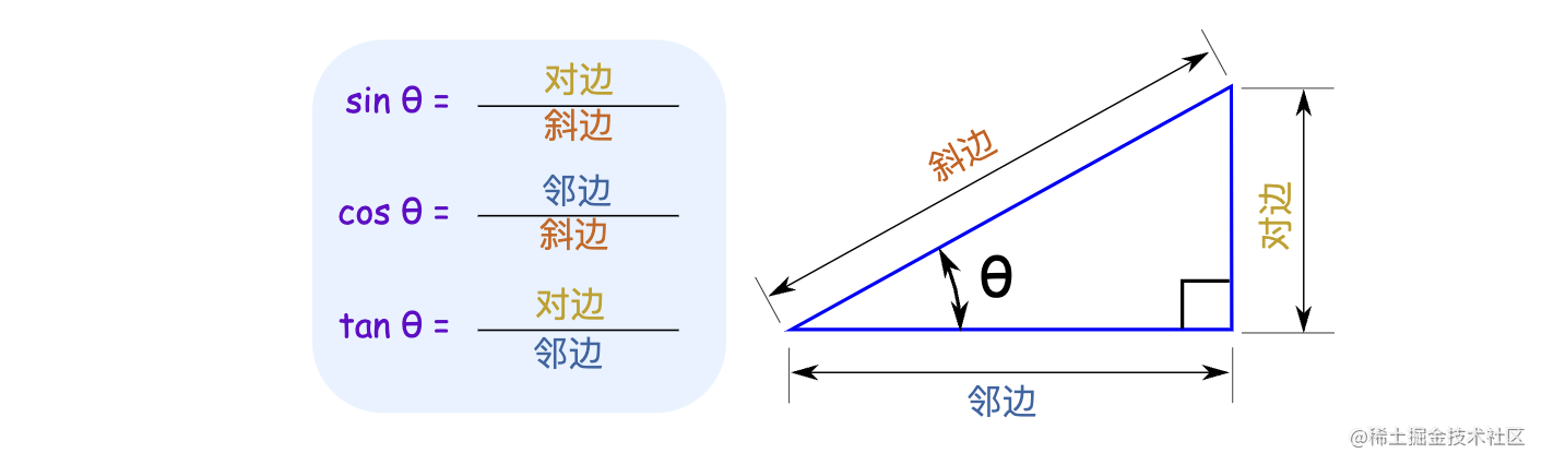 我们使用到三角形的知识点 - 正弦(sine)sin(θ), 余弦(cosine)con(θ) 求距离。