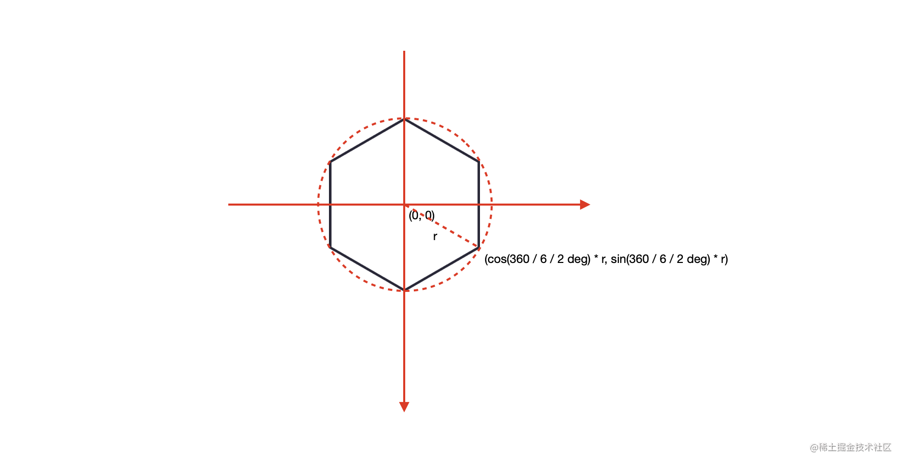 假设我们设置圆心坐标为 (0, 0),圆的半径为 r,那么我们将得到右下角的点坐标为 (cos(360 / 6 / 2 deg) * r, sin(360 / 6 / 2 deg) * r)。同理,我们可以得到其他 5 个点的的坐标。相关代码如下:
