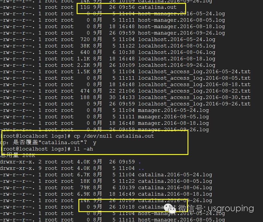 可将来巨大的catalina.out文件直接删除,也可采用cp /dev/null catalina.out文件,将空间覆盖此文件。