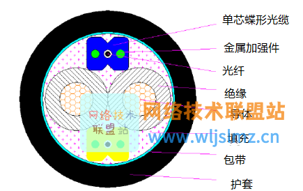 光电混合缆的横截面图如下图所示,它把光纤和铜导线集成到一根线缆中,通过特定的结构和保护层设计,确保光信号和电能信号在传输过程中不会发生互相干扰的现象,适用于各类网络系统中的综合布线,可以有效降低施工和网络建设成本,达到一线多用的目的。