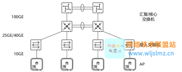 如下图所示,在园区网络中,光电混合缆主要用于接入层,即接入交换机和AP之间的这段线缆,主要解决两个方面的问题:Wi-Fi网络的数据回传以及AP的PoE供电。