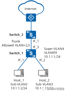 如下图所示,Switch_1上配置了Sub-VLAN2、Sub-VLAN3和Super-VLAN4,Switch_1的IF_1和IF_2配置为Access接口,IF_3接口配置为Trunk接口,并允许VLAN2和VLAN3通过;Switch_2连接Switch_1的接口配置为Trunk接口,并允许VLAN2和VLAN3通过。