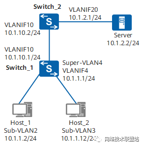 如下图所示,用户主机与服务器处于不同的网段中,Switch_1上配置了Sub-VLAN2、Sub-VLAN3、Super-VLAN4和VLAN10,Switch_2上配置了VLAN10和VLAN20。