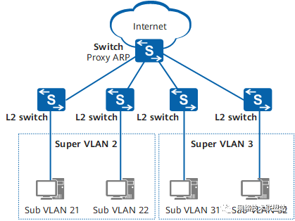 VLAN聚合在实现不同VLAN共用同一子网网段地址的同时,也给Sub-VLAN间的三层转发带来了问题。普通VLAN中,不同VLAN内的主机可以通过各自不同的网关进行三层互通。但是Super-VLAN中,所有Sub-VLAN内的主机使用的是同一个网段的地址,共用同一个网关地址,主机只会做二层转发,而不会送网关进行三层转发。即实际上,不同Sub-VLAN的主机在二层是相互隔离的,这就造成了Sub-VLAN间无法通信的问题。