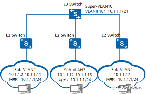 如下图所示,按照VLAN聚合的实现方式,令VLAN10为Super-VLAN,分配子网10.1.1.0/24,VLAN2~VLAN4作为Super-VLAN10的Sub-VLAN。