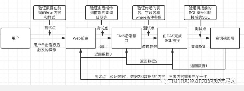 数据查询展示阶段是指从Web前端到数据查询服务DAS的阶段。在该阶段我们需要验证SQL模板的正确性、SQL拼接的正确性、查询性能、易用性,以及数据的准确性和一致性。数据查询展示阶段涉及业务逻辑且SQL拼接较复杂,因此该阶段往往耗时最久。以用户单击“看板”并查看为例,用户单击看板后,触发的操作和相应的功能测试点如下图所示。