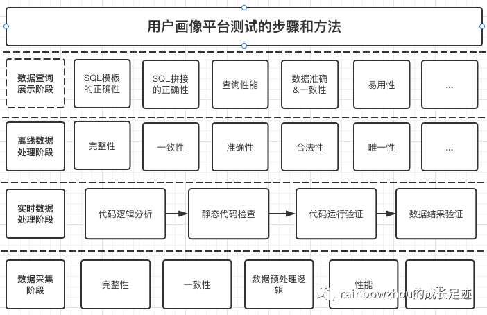 质量保障需要透过现象看本质,用户画像平台全流程测试,即需要保证数据采集、ETL处理、查询计算和可视化展示均正确。通过参考用户画像架构图设计,我们将测试流程拆分为4个阶段:数据采集、实时数据处理、离线数据处理、数据查询展示。每个阶段的测试步骤和测试方法如图所示。