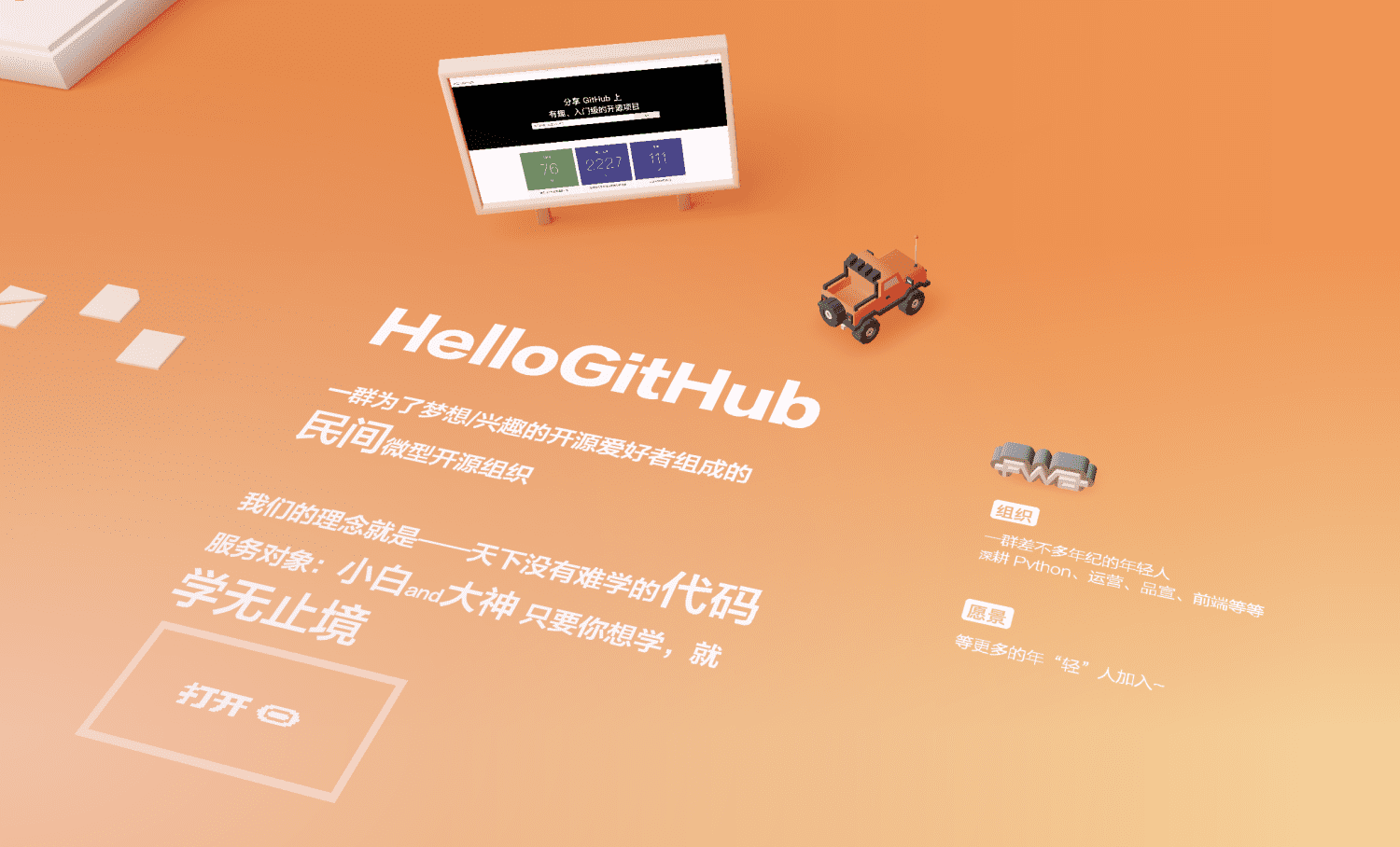 今天 HelloGitHub 给大家带来的是一款开源的 3D 博客项目,实话说我第一次访问这个博客的时候都惊呆了,颠覆了我对博客的认知。进去后需要通过操控一辆 3D 的小汽车,自己“找到”文章才可以阅读,特别有意思!
