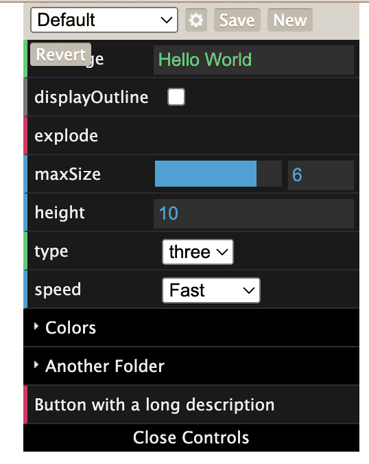 这个 3D 博客项目用到的另外一库是:dat.gui.js,它是一个用于在 JavaScript 中更改变量的轻量级图形用户界面,使用这个库可以很容易地创建出能够改变代码变量的界面组件。实现的界面大致样子如下: