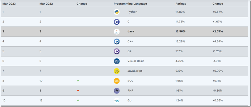 2、 C#是第五种流行的语言
