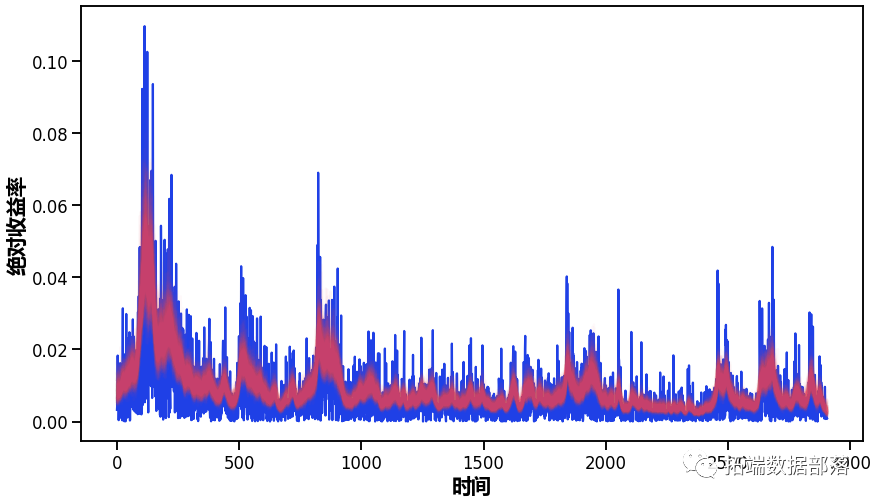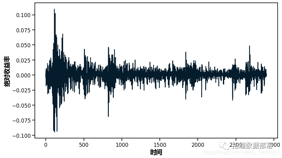 正如你所看到的,波动性似乎随着时间的推移有很大的变化,但集中在某些时间段。在2500-3000个时间点附近,你可以看到2009年的金融风暴。