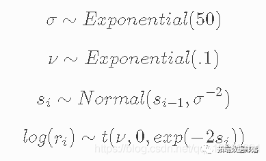 资产价格具有随时间变化的波动性(逐日收益率的方差)。在某些时期,收益率是高度变化的,而在其他时期则非常平稳。随机波动率模型用一个潜在的波动率变量来模拟这种情况,该变量被建模为随机过程。下面的模型与 No-U-Turn Sampler 论文中描述的模型相似,Hoffman (2011) p21。
