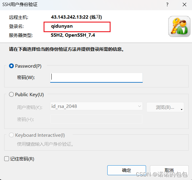 后面我们再次登录时,普通用户就是我们的默认登录用户,而不再是root。此时输入普通用户的密码,连接登录即可。
