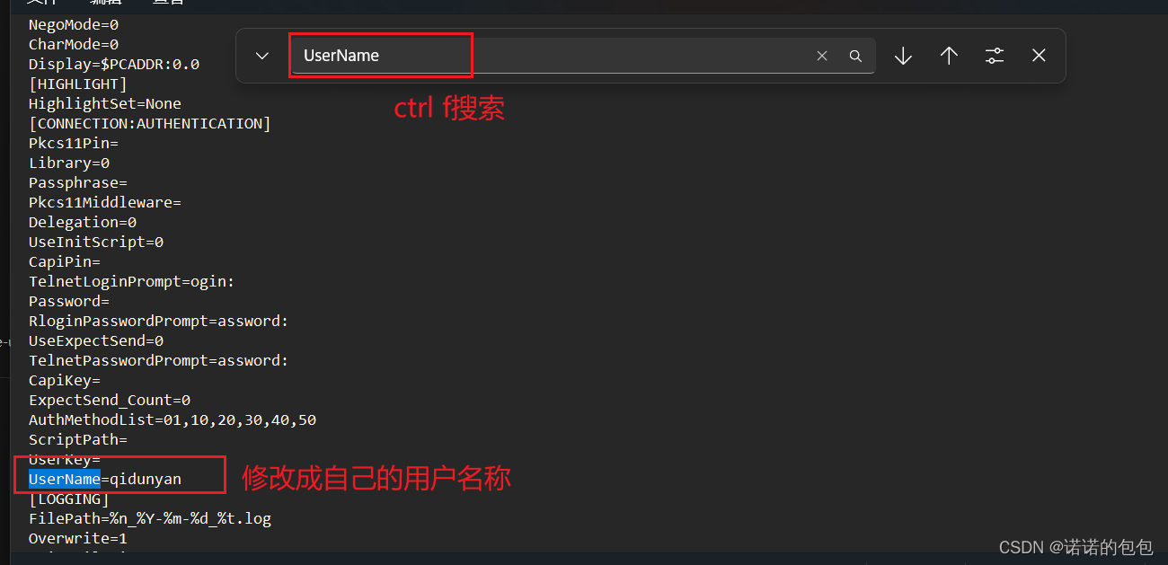 三、ctrl f搜索UserName,并修改为自己的普通用户名称。修改完ctrl s保存,然后退出。