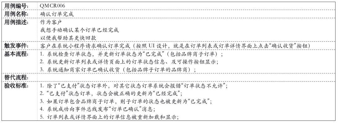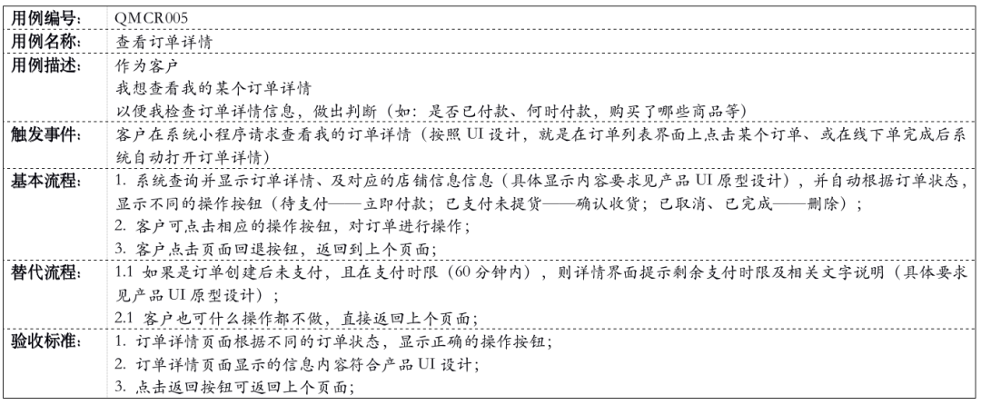 从图中可以看出:“业务用例规格书”分“用例描述、触发事件、基本流程、替代流程、验收标准”这 5 个主要部分进行描述,它就是在描述某个业务用例具体的需求。一般来说,这个工作的完成有两种情况: