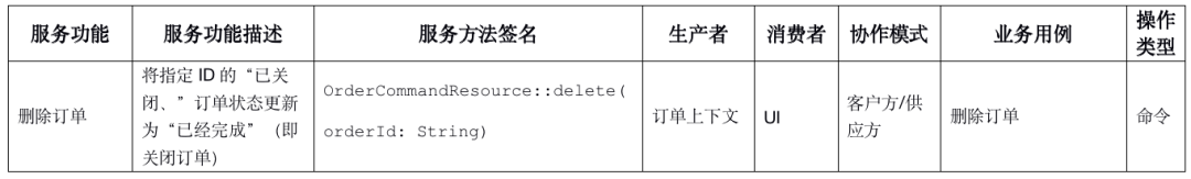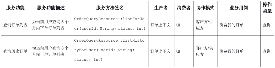 最后,将整个限界上下文的服务契约表进行汇总。汇总后的服务契约表,就可以作为限界上下文的“代码开发工作范围”了。