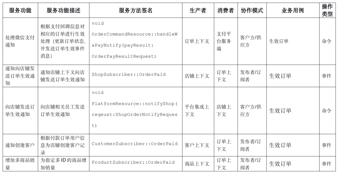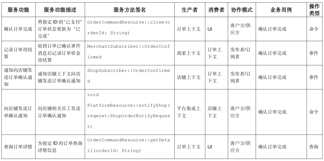 注:这里的领域事件通知类的服务功能契约,因为与“确认订单完成”相同,故不再重复列出。