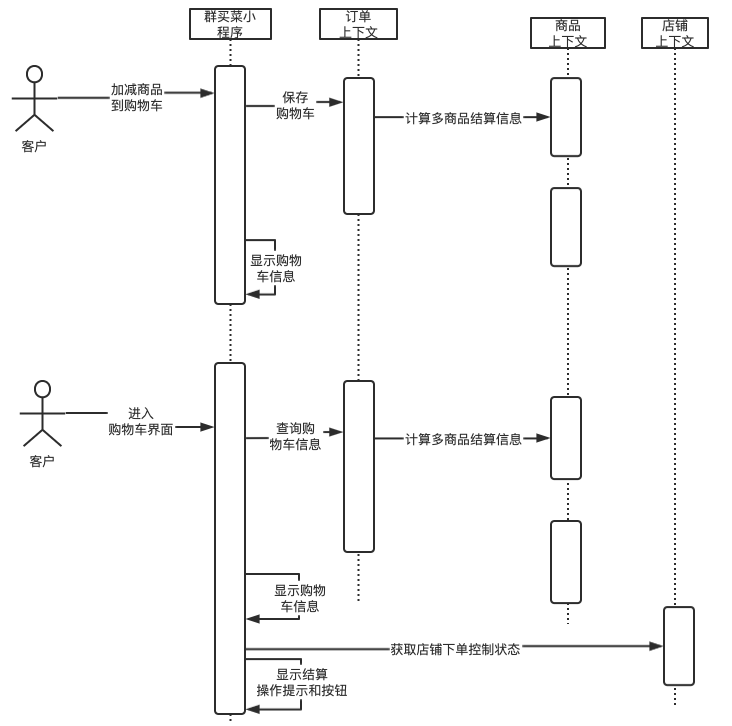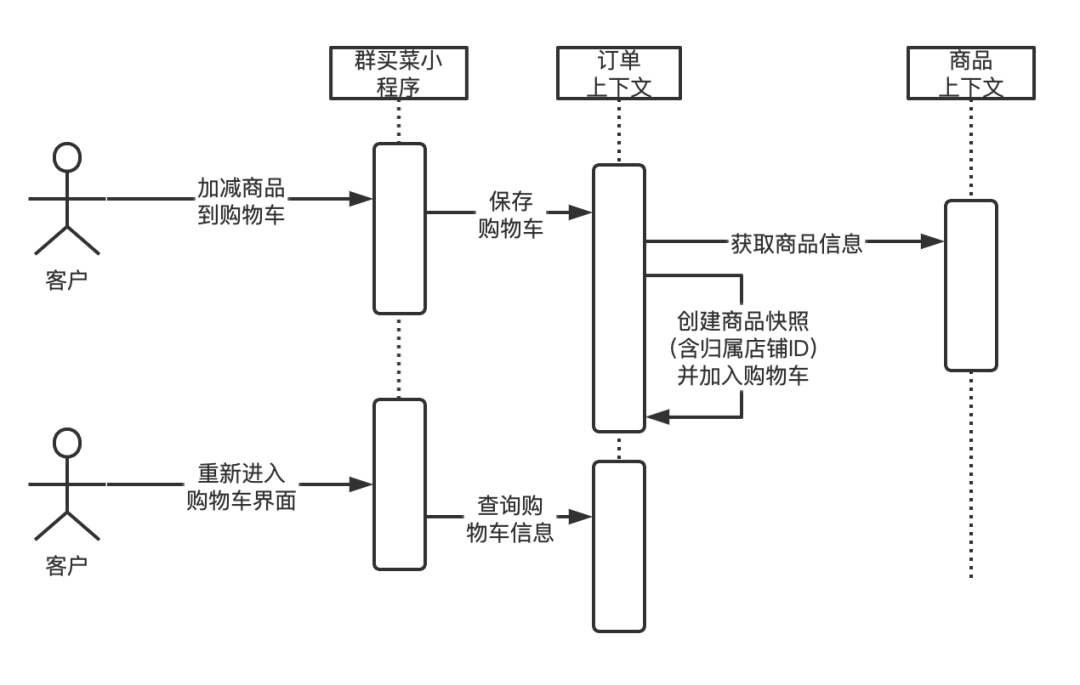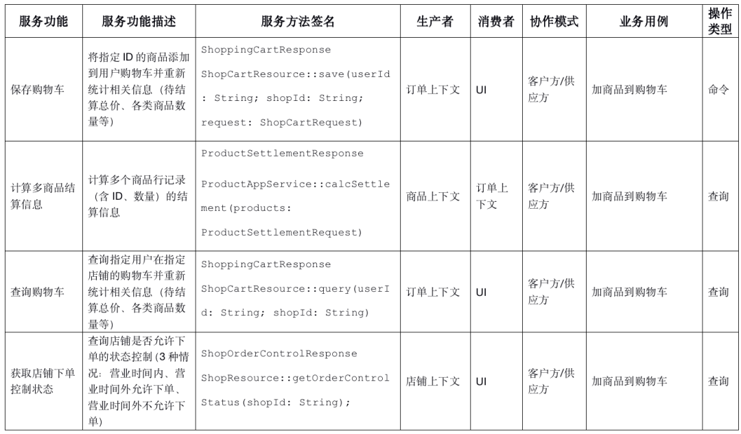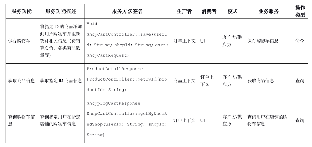 基于上图,我们就发现“订单上下文”需要给出 2 个服务(即被调用箭头指出来的服务):保存购物车、查询购物车信息,而“商品上下文”需要提供“获取商品信息”服务。当然,需要说明的是:有些情况下,业务用例如此简单,以至于并不需要画 UML 序列图就能够识别出来服务列表——比如:业务用例“查看商品详情”很明显只有“商品上下文”的一个服务“获取商品详情“。