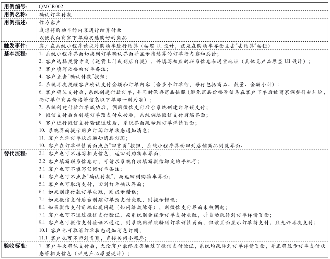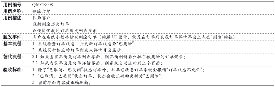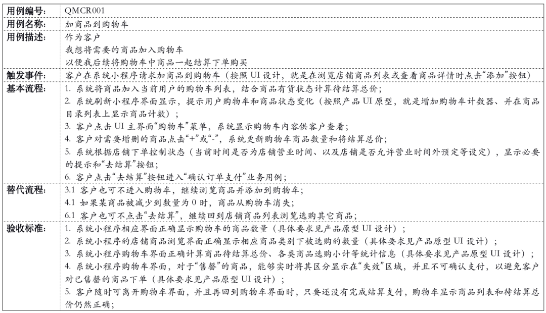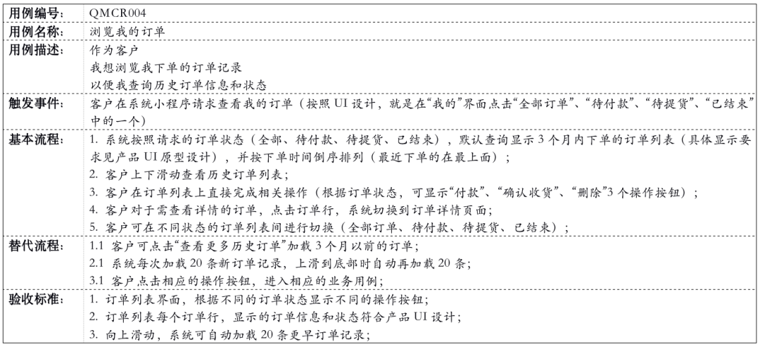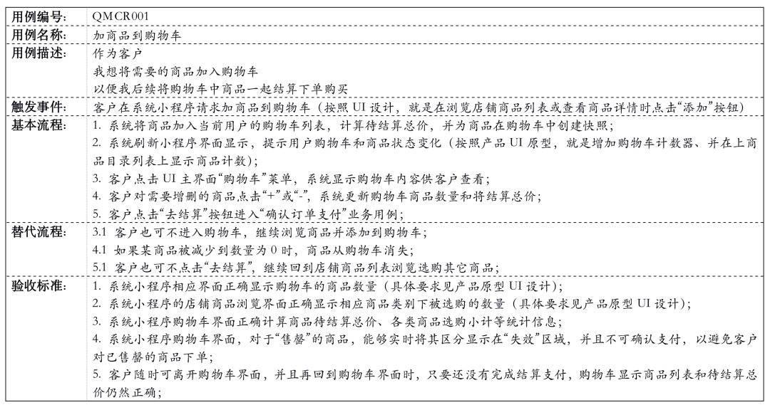 业务用例规格书。这其实是用 UML 描述需求时附带的一份文档。与“业务用例识别”只是 UML 图形列出用例不同,它是对业务用例的一个补充性文字说明,一般长成下图这个样子:
