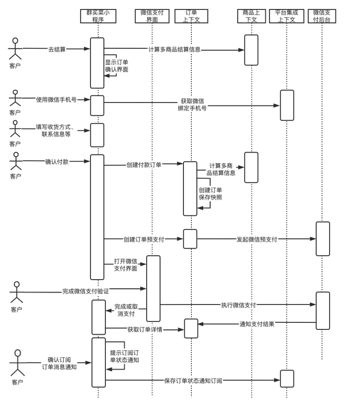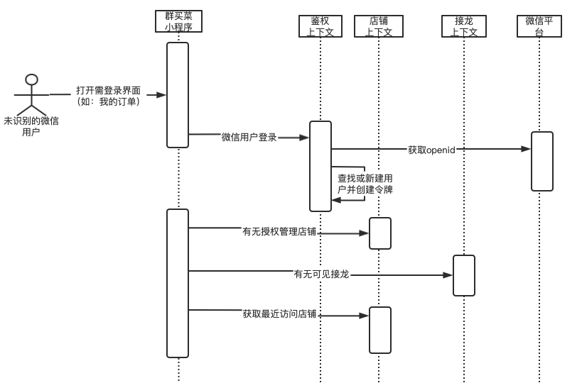 为了支持客户下单相对应的 2 个业务用例:鉴权上下文的“登录系统”、平台集成上下文的“获取微信绑定手机号”。