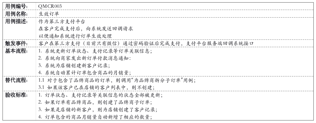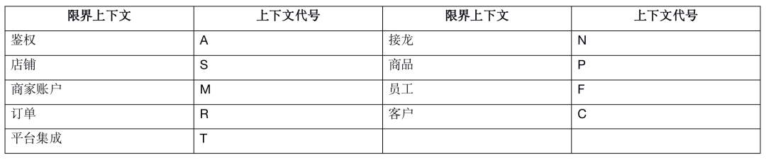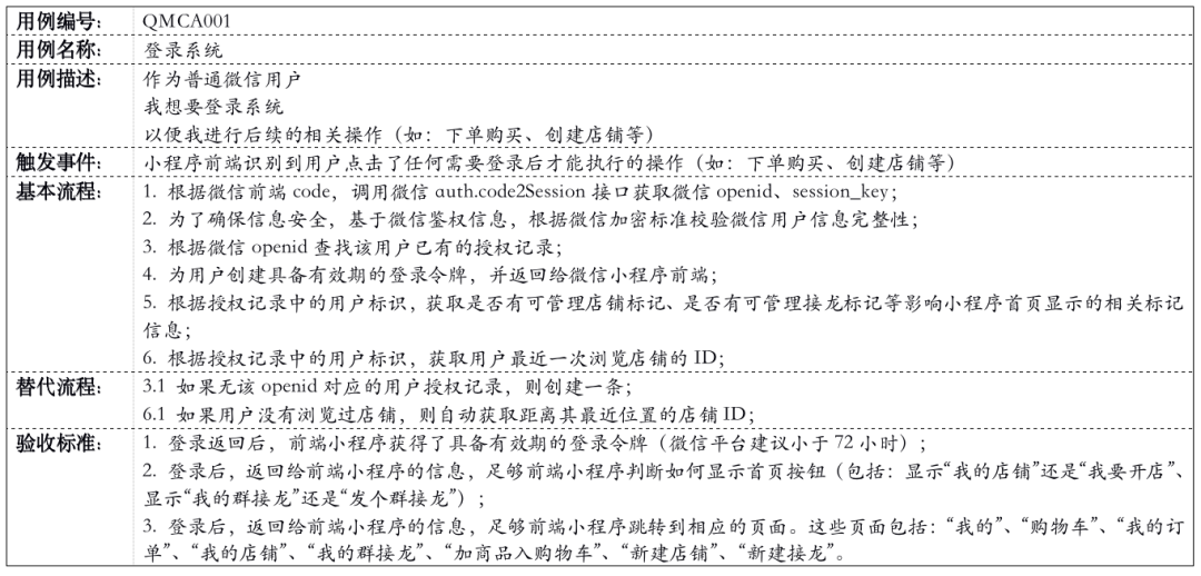需要说明的是:后面的业务用例编号规则为“QMC+上下文代号+用例序号”。其中“QMC”是群买菜拼音开头字母,上下文代号列表如下: