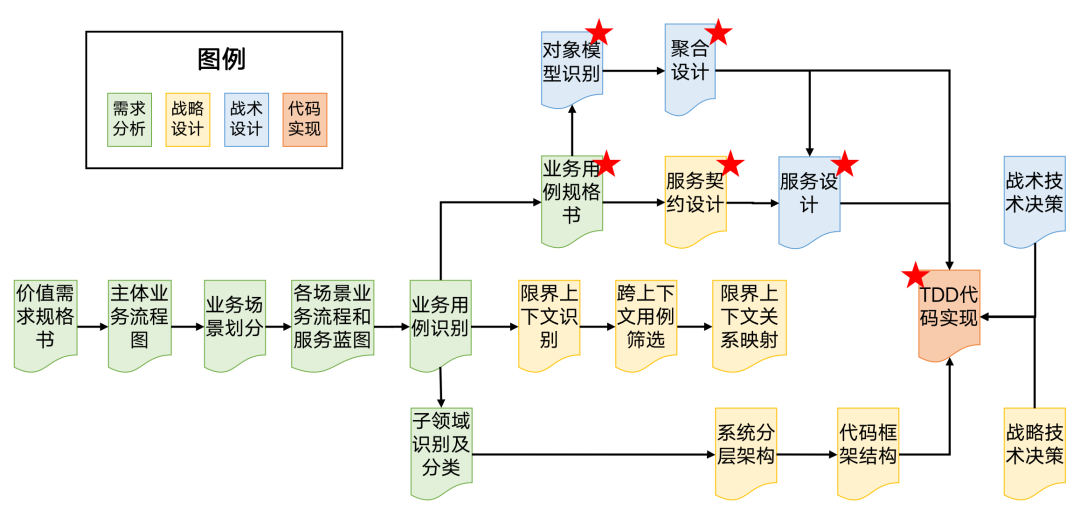 很显然,在整个 DDD 设计工作过程中,有些工作是可以通过 scrum 敏捷迭代的,有些是基本上一次性设计就完成的(后续只是完善)。下图我对 DDD 整体工作流程中,建议 scrum 敏捷迭代的工作成果进行了标注——见红色五角星标注。需要说明的是: