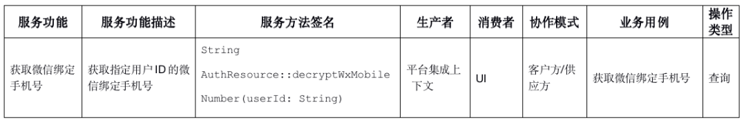 其次,按业务用例给出服务契约表。将识别出来的服务接口,确定服务方法签名、识别操作类型、确定实现模式(客户/服务端模式、消息订阅模式等),并将最终结果汇总到如下表所示的“服务契约表”中: