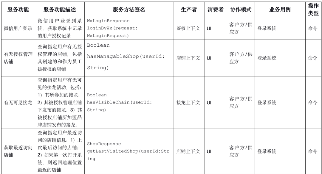 为了方便后面的战术设计,尤其是战术设计中的服务设计,我们将各上下文相关的业务用例所识别出的服务契约,按照其生产者上下文进行汇总归类如下: