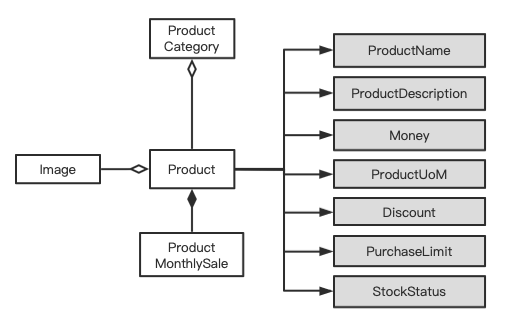 该对象模型中,需要区别直接访问入口的实体对象有“商品类别”、“商品”。“商品类别”需要单独访问是需要在前端界面支持列出所有的商品类别,“商品”需要单独访问入口显而易见。而其它实体对象“商品图片”、“商品月销量”是不需要单独访问入口的,故最终聚合划分如下图: