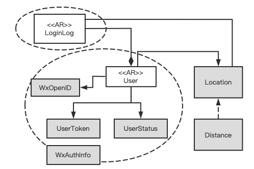 本上下文只有两个实体对象:用户、登录日志。唯一要回答的问题是:“登录日志”是作为“用户聚合”的内容、还是独立聚合存在?这取决于业务上有没有不需要通过“用户”实体对象而直接访问“登录日志”的需求场景。从实际需求来说,“登录日志”是动词时标对象,我们前面做分析时已经意识到记录它的目的是为了方便以后的财务、法律风险核查,也就是说可能会开发针对“群买菜”平台后端运营的相关功能,而这些功能是可能是直接查询某个时间段、或满足某登录地理位置范围等审计条件下的“登录日志”,而并不需要通过“用户”对象来访问它。为此,我们将聚合划分如下图(图中<<AR>>标记表示是“聚合根”):