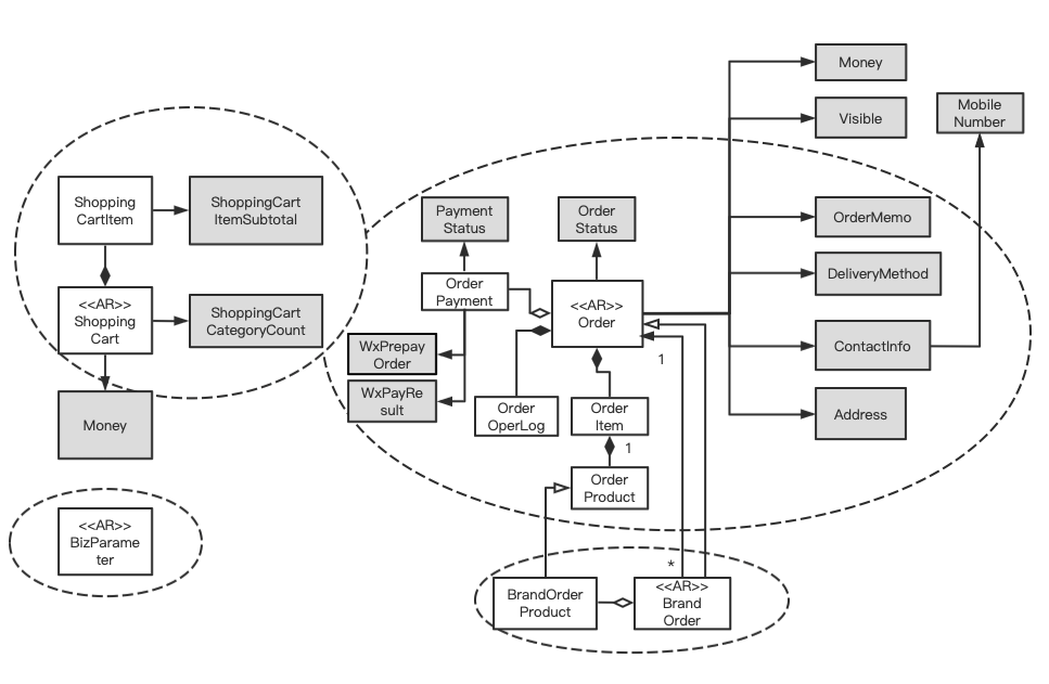 事实上,上面的对象模型已经基本将聚合划分清晰了。唯一需要考虑的,就是“品牌子订单”需要和“订单”这两个实体对象分开在不同的聚合中,因为“品牌子订单”对于品牌商来说,是需要有独立的访问入口的(如:查询某品牌商收到的子订单),故在聚合上必须区分开来。划分聚合后的对象模型如下图: