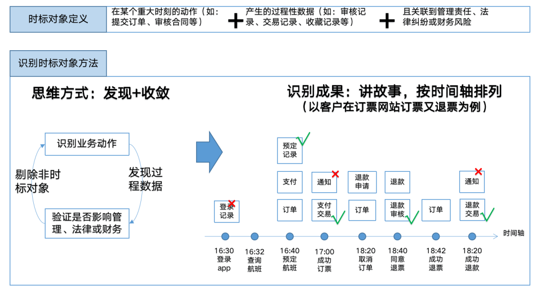 2. 动词建模。动词建模的主要目的,是为了发现“时标对象”。时标对象我们可以这样来理解:它是用来记录在某些关键时刻涉及到管理责任、法律纠纷或财务风险的“过程性记录”。这种记录的真正作用,并不是业务本身所需要的,而更多是从企业管理角度来考虑的。下图展示了“时标对象”的概念定义和识别方法(绿勾即为时标对象,而红叉则不是):