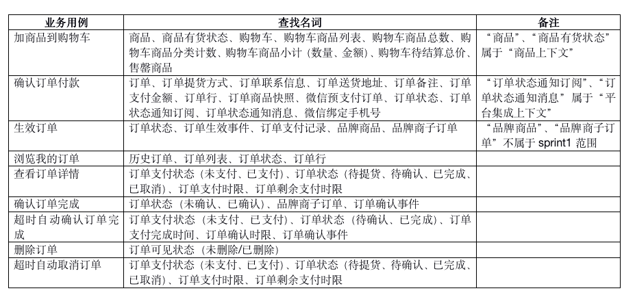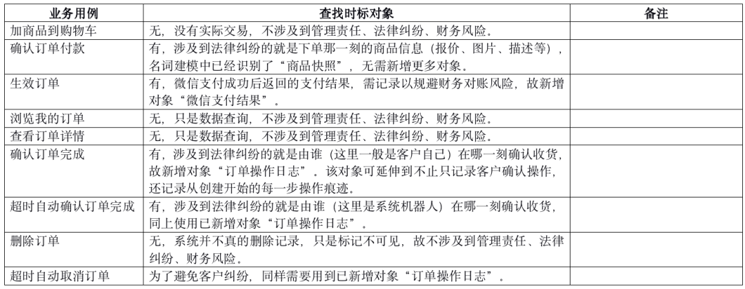 对订单上下文各业务用例的时标对象分析如下表: