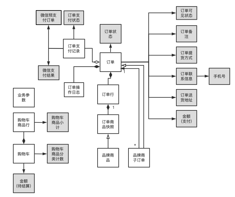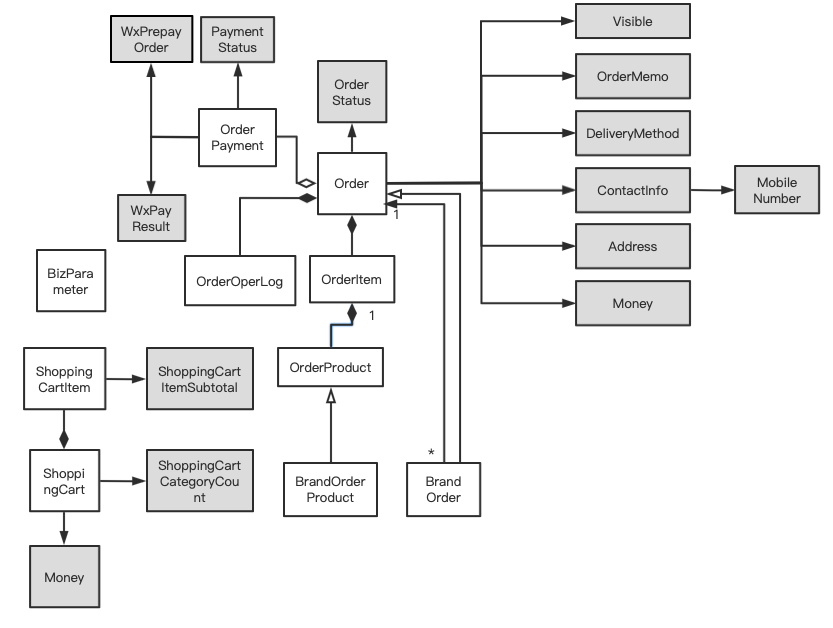 需要说明的是:“订单行”与“订单商品快照”之间其实是合成关系。因为订单商品快照依赖于订单行管理其生命周期,也就是因为订单行的存在而存在。但这里的“合成”关系有点特殊:一个订单行只会有一个商品快照。
