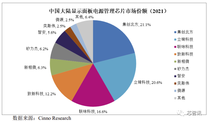 在电源管理芯片领域,根据CINNO Research 2021年的统计数据,公司在中国大陆显示面板电源管理芯片的市场占 有率排名中,位列全球厂商第一名;