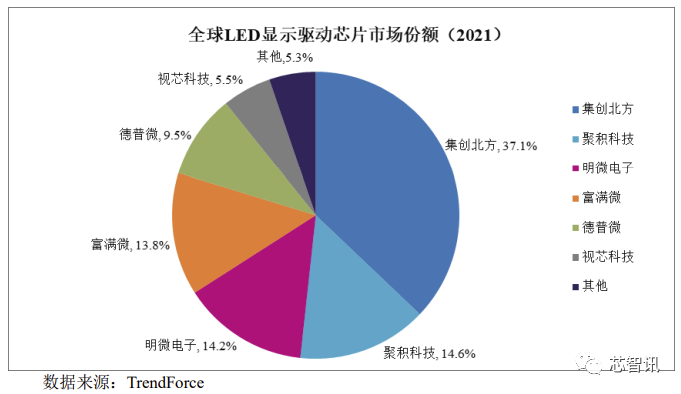 在LED显示驱动芯片领域,根据TrendForce的统计数据,公司在全球 LED 显示驱动芯片的市场占有率排名中,2019年、 2020年及2021年持续位列全球厂商第一名,2021年市场份额为37.2%。