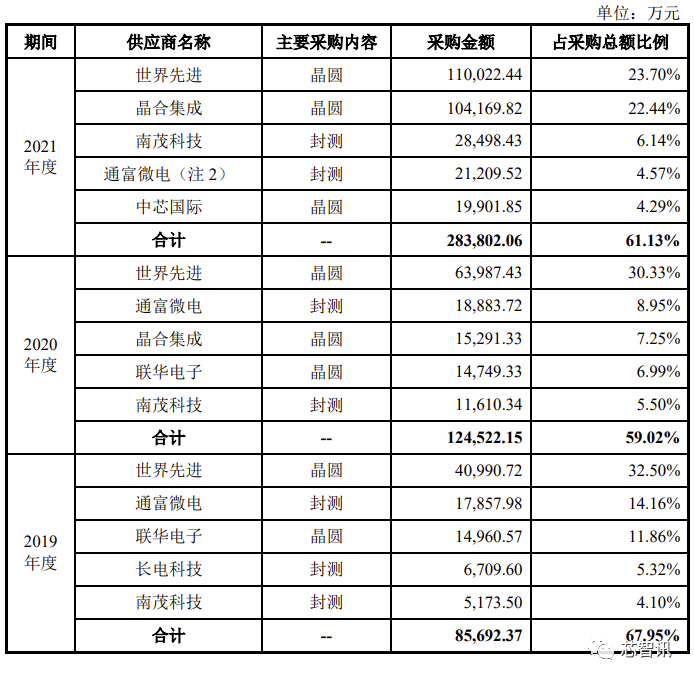具体来看,报告期内,世界先进、晶合集成、联华电子、中芯国际都曾为集创北方的晶圆代工商,通富微电、长电科技、南茂科技则是集创北方的封测供应商。其中,世界先进一直是第一大供应商,同时通富微电、南茂科技也一直是集创北方的前五大供应商。值得一提的是,2021年,中芯国际也成为了集成北方的前五大供应商。