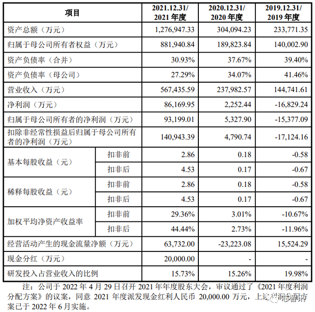 报告期内,公司实现营业收入分别约为14.47亿元、23.80亿元和 56.74亿元,营业收入的复合增长率高达98.00%;公司实现归属于母公司股东的净利润分别为-1.54亿元、5327.90万元和9.32亿元,2020年度扭亏为盈,2021 年度相比2020年度暴涨1649%。