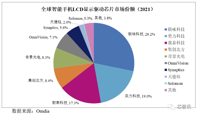 根据Omdia 2021年的统计数据显示,集创北方在全球智能手机 LCD 显示驱动芯片、智能手机 LCD TDDI 芯片的市场占有率排名中,均位列中国大陆厂商第一名;