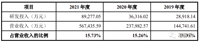 报告期内,公司研发投入分别约为2.89亿元、3.63亿元、8.93亿元,呈现持续快速增长态势。累计研发投入为15.45亿元。报告期各期,公司研发投入占营业收入的比例分别为 19.98%、15.26%、15.73%。