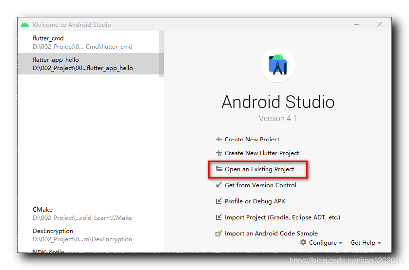 关掉 Android Studio 开发界面 , 进入到欢迎界面 , 选择打开一个已存在的项目 " Open an Existing Project " 选项 ;