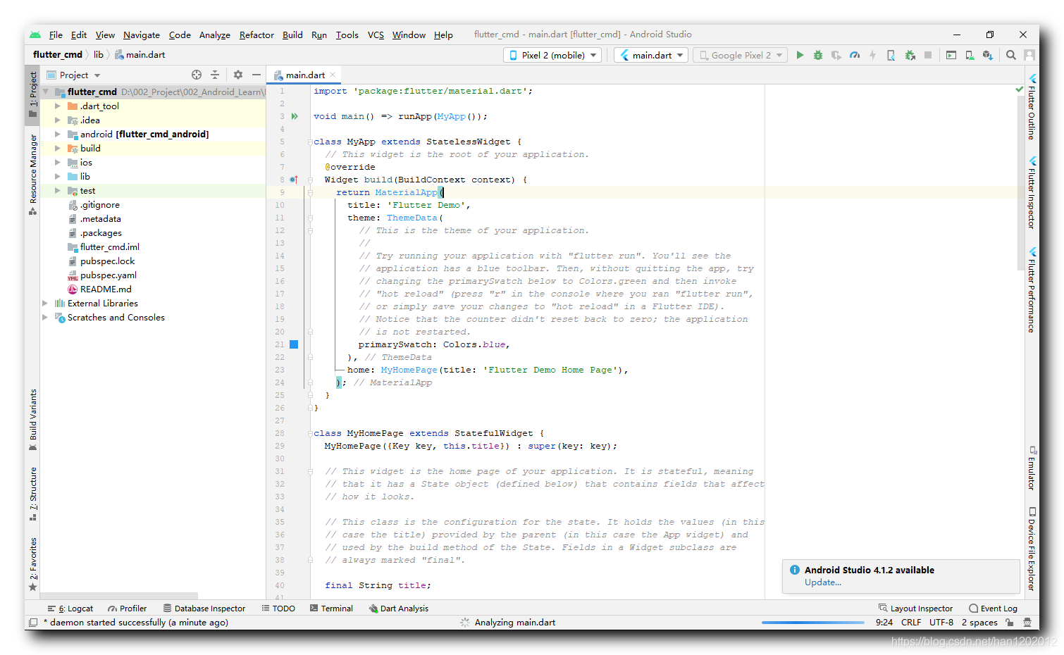 在上一小节执行 flutter create flutter_cmd 命令创建 Flutter 应用基础上执行下面的操作 ;