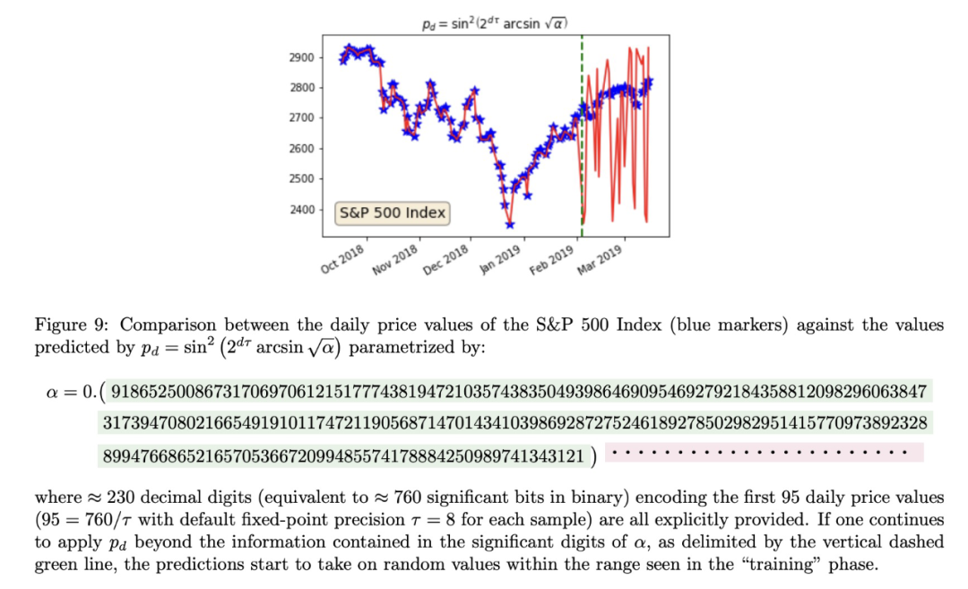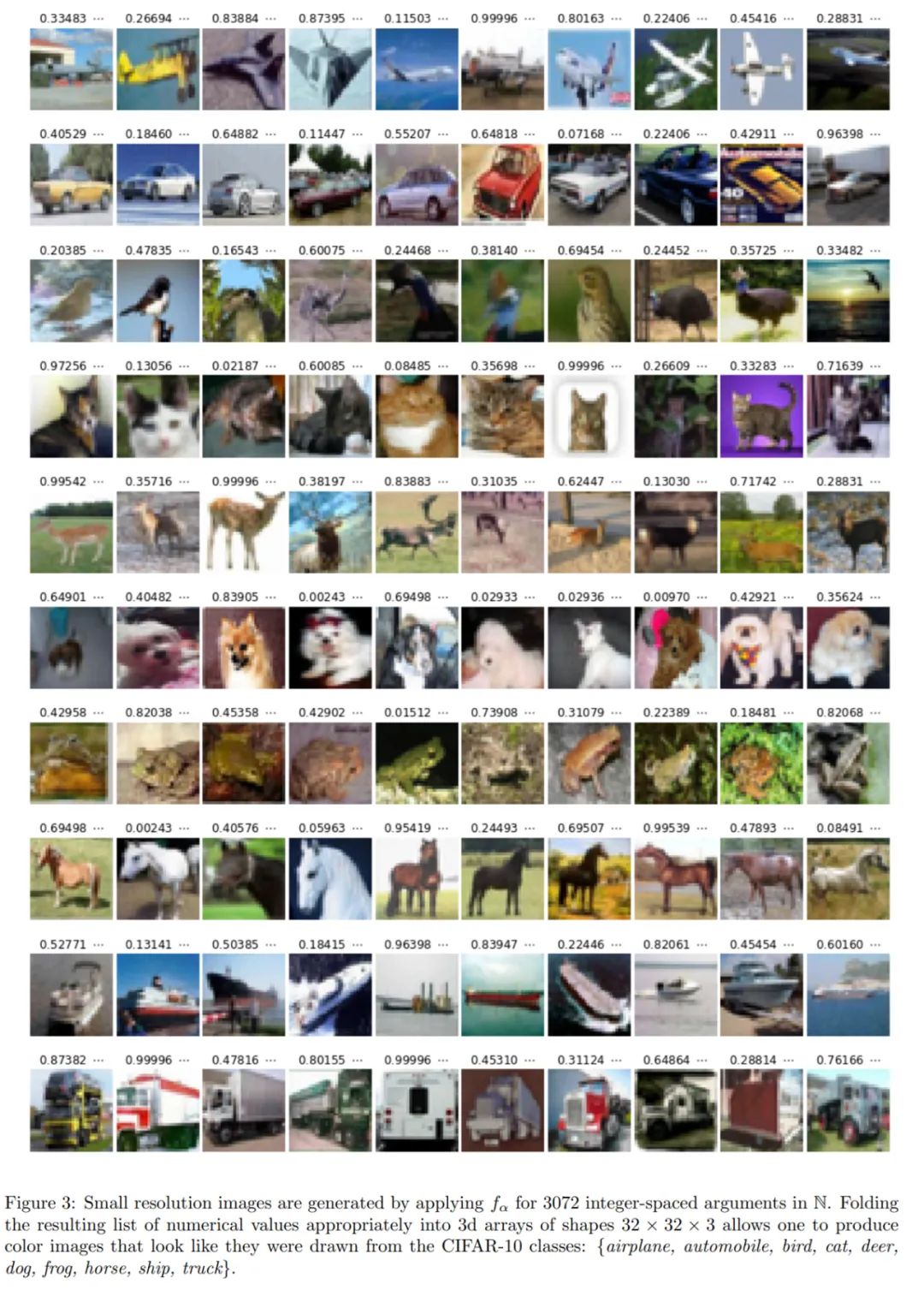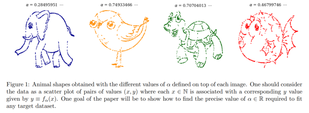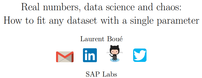 相同的思想,近日,一篇发表于 2019 年 4 月的老论文《 Real numbers, data science and chaos: How to fit any dataset with a single parameter 》,在推特上又引来一波讨论量。论文作者 Laurent Boué 现为微软高级机器学习科学家,他讲述了「如何使用单个参数拟合任何数据集」。