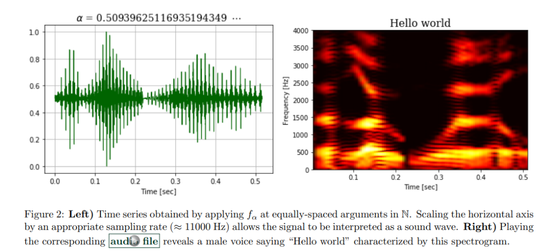 在演示完 f_α 可以生成任何类型的上述涂鸦绘图之后,该论文继续使用文字「Hello world」进行了展示,以进一步说明该方法的功能。下图 2 展示了如何使用精心选择的 α 值来生成复杂的高维声学信号,编码实际表达的是「Hello world」。