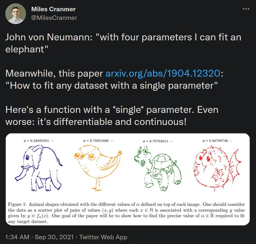据说,冯 · 诺依曼有次参加一个会议,某物理研究员在报告一个研究进展,用了一个非常复杂的模型,试图论证实验数据点都落在同一条曲线上,符合模型预期。于是冯 · 诺依曼就说了一句,还不如说这些点都在同一个平面上。最后,冯 · 诺依曼留下了一句名言:「With four parameters I can fit an elephant, and with five I can make him wiggle his trunk.」